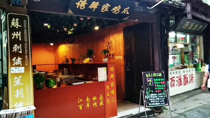 这个也是做熟食的。是一群年轻人大学毕业后,在甪直创业开的店。他们祖父辈就已经营卤味数十年,真正的秘卤配方,真正世传了三代。招牌鸡爪软烂入味,翅中肉感细腻。他们家的卤味确实很特别,我吃过很多这种熟食,但感觉这种味道最特别,最香。值得一提的是,他们家的鸡爪是咸鲜味的,不像镇里其他家的美食都是甜的,这点对于我这个不习惯甜食的我来说非常喜欢。店在进利桥下来就是,好像在西汇上塘街。