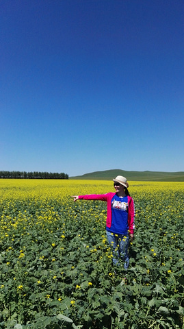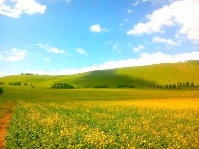 一路行驶,一路遇见,辽阔的草原,成群的牛羊,高高的山坡,密密的树林,就象一幅动态的水彩画。忽然,一片金色映入眼帘,油菜花开了!这里的油菜花完全不是我见过的被田埂隔成一小块一小块的,而是大片大片的花海。来自游记最美的风景在路上——呼伦贝尔六日行