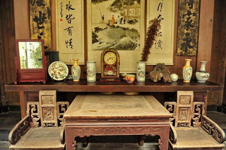 与所有徽州古民居一样,厅堂的太师壁上悬挂匾额,中堂是字画,堂下条案上则摆放着东瓶西镜、自鸣钟,取其谐音“终身平静”。