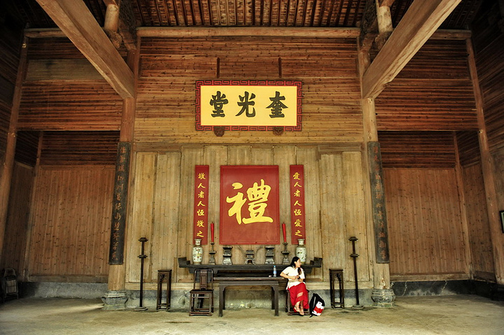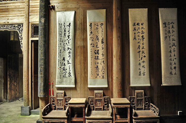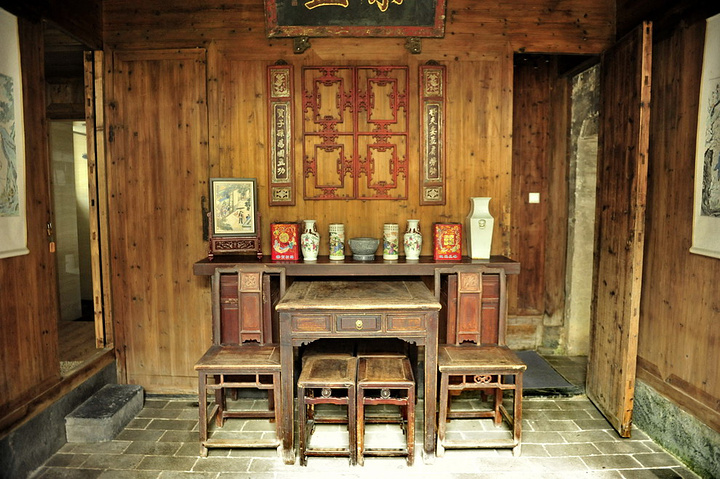 厅堂的条桌前摆八仙桌及太师椅,厅堂两侧设茶几及座椅,侧壁上挂名人字画。厅堂的柱面则多挂木制条屏楹联。常见的楹联有:“几百年人家无非积善,第一等好事只是读书。”;“善为至宝一生用,心作良田百世耕。”;“世事让三分,天宽地阔;心田存一点,子种孙耕。”;“读书好营商好效好便好,创业难守成难知难不难。”从楹联中可以看到传统的徽州人家崇尚诗书、恬淡平和的生活态度。