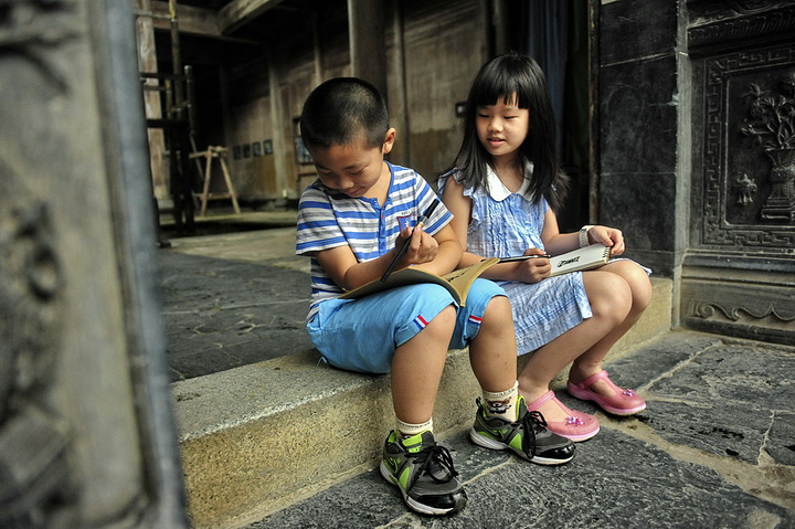 过了一会儿,小姑娘和同行的小男孩坐在门槛上,画起画来。