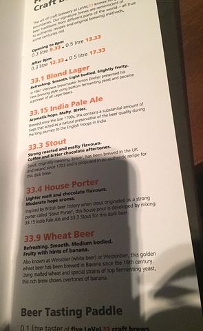 环境超好、啤酒价格对比这种高度这个环境这个地理位置的BAR,真的好便宜好实在。 我喝的是Beer Tasting Paddle,就是这里的5种啤酒,Blond Lager 、India Pale Ale、Stout、House Porter、Wheat Beer 的每种100ML的体验,这对于我这种有选择障碍的人来说真是太好不过了。 5种啤酒味道由浅逐深,颜色也是这样~ 啤酒确实很不错~