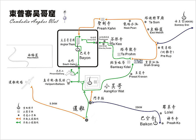 吴哥景点示意图(图中标明的都是主要景点):绿色的是小圈;泥巴色的是大圈;黑色的是外圈。