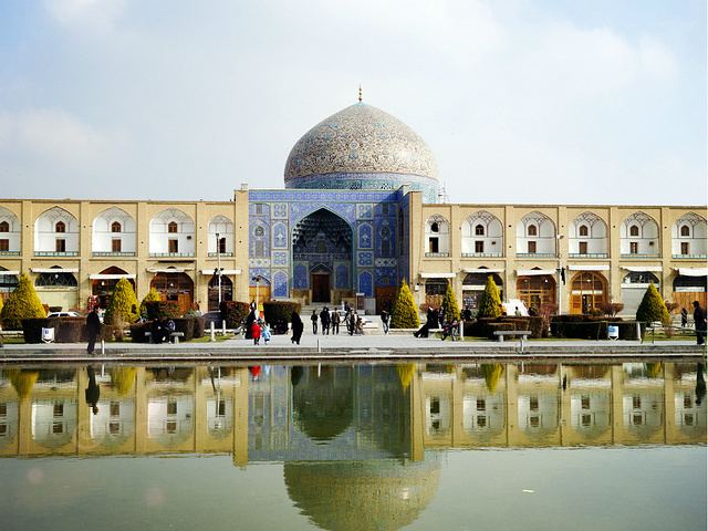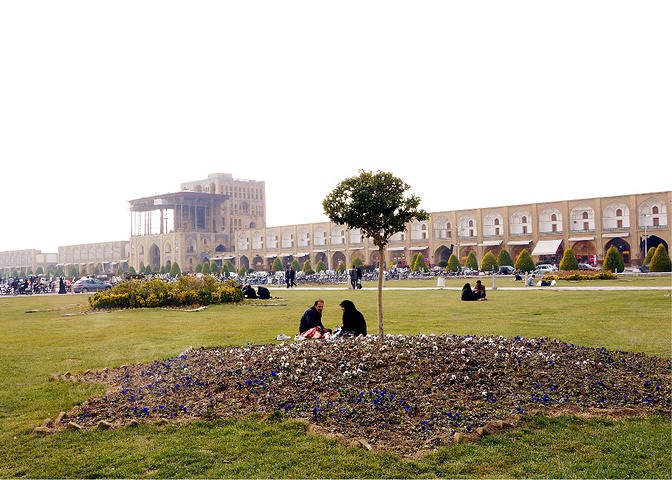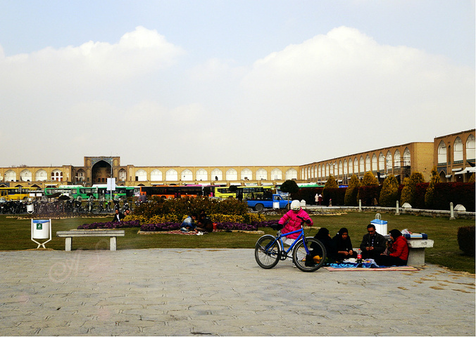 在伊斯法罕有一块顶着世界文化遗产头衔,并被LP描述为仅次于天安门广场的皇家广场Iman Khomeini Sq,这座占地面积超过8万平方米的是一个长方形狭长(南北长,东西窄)广场,中心是草坪、绿树、水池和喷泉,广场四周吗,精美的清真寺,皇宫 巴扎 一应俱全。四周建筑和拱门式的围墙还有清真寺蛮不错的。