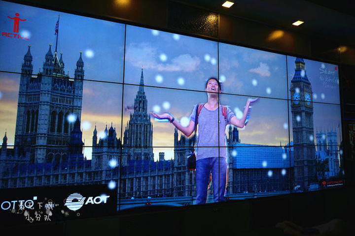 候机区还有一个互动屏,走近这块屏幕,人就会被映在屏幕上,进入各种场景里面。天啦,多么符合我们这种没见过世面的观光客啊,三人又立刻在这里搔首弄姿了半天。