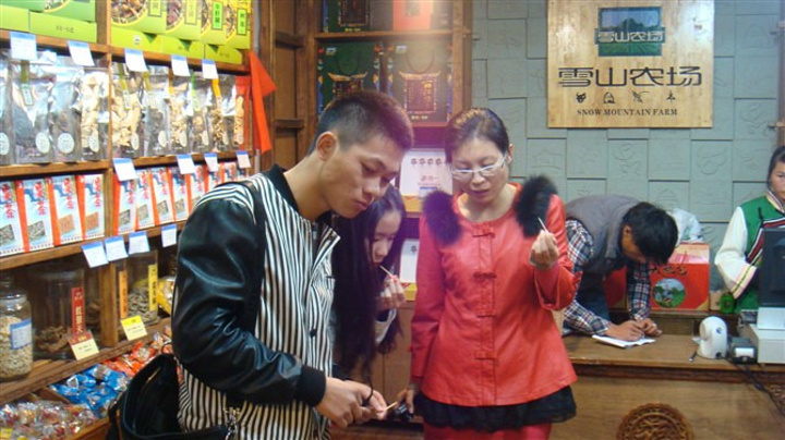 从拉市海出来,在路边有一间茶馆,说是免费喝茶,我们就进去了,里面的服务员推荐一种“女儿茶”,第一杯喝起来有一种特别的玫瑰香,所以就买了几罐,后来发现是在残次的茶叶上面撒了玫瑰香精的,其实茶很差,所以大家千万不要买哦!