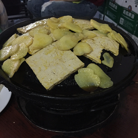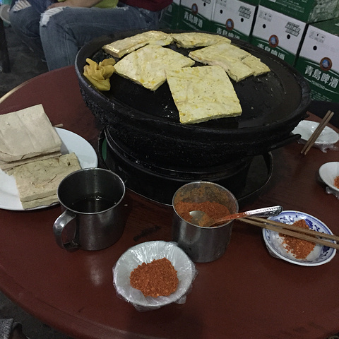 八步烙锅臭豆腐--豆腐和土豆放在烙锅上烤,熟了之后蘸着特有的辣椒粉吃。因为豆腐和土豆没有加调料,所以烤完之后只有它们本身的味道,我特别喜欢这家店里的辣椒粉,吃了还想吃!