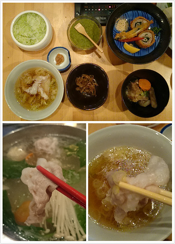 肉被切成薄片,入锅涮个几秒钟就可以拿出来,蘸着独有的汤料吃,完全没有腥味,也不油腻,特别鲜美。而且蘸猪肉的汤料里可以加上大量的葱,九州特有的柚子酱,味道更正宗。
