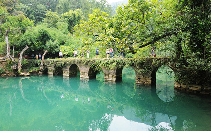接着就是景区以此命名的这个小巧玲珑的七孔古桥了。桥上爬满藤蔓蕨草,两边葱郁茂密的古木环绕,桥下碧水流淌,要不是有行走的游客,这里简直静得像一幅油画!