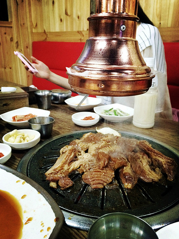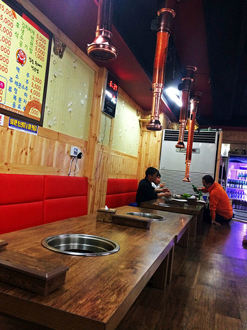 今天最开心的是在酒店附近的街道上闲逛然后完全凭心情进了一家烤肉店,具体的名字和位置已经完全记不清了…………一进门就超有韩剧的感觉!店家阿姨人超好的,看我们是歪国人看不懂菜单很详细的跟我们介绍,还为我们示范生菜包烤肉的正确吃法~