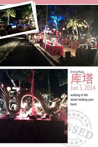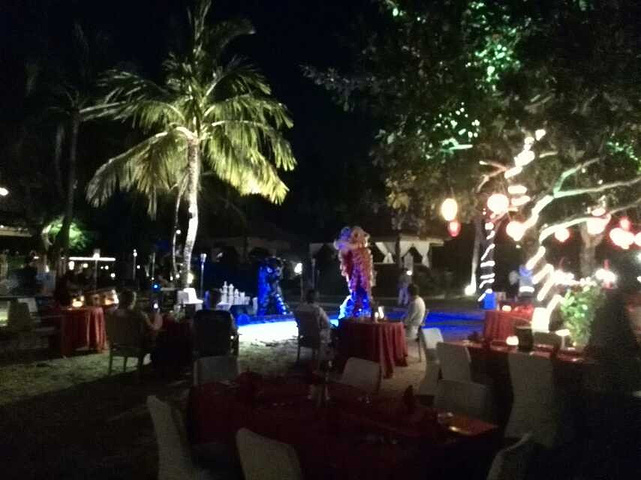经过靠海面的酒店花园时.他们为酒店客人提供的自助餐等活动,有少许客人在用餐,现场版的音乐表演.还有好看的舞狮表演喔.在中国已经很难得看到了,在巴厘岛觉得还是很新奇的。