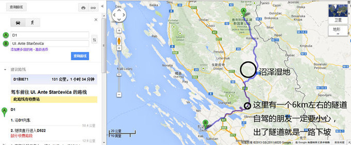 我是从十六湖公园出来之后一路开车西行,经过一个巨大的沼泽湿地抵达扎达尔的。在沿途要有一个特别长的高速隧道超过5km如果自驾的朋友要特别注意,之后就是10几km的超级下坡,还有一个明显的发卡弯道,因为上午已经在森林公园走了5个小时,几乎没有吃中午餐。这一路下来真的很雷,130km的距离很准确,其中一多半是乡间公路。开了大概2个半小时,晚上抵达港口城市扎达尔