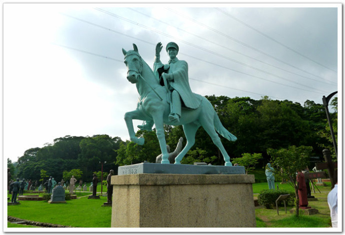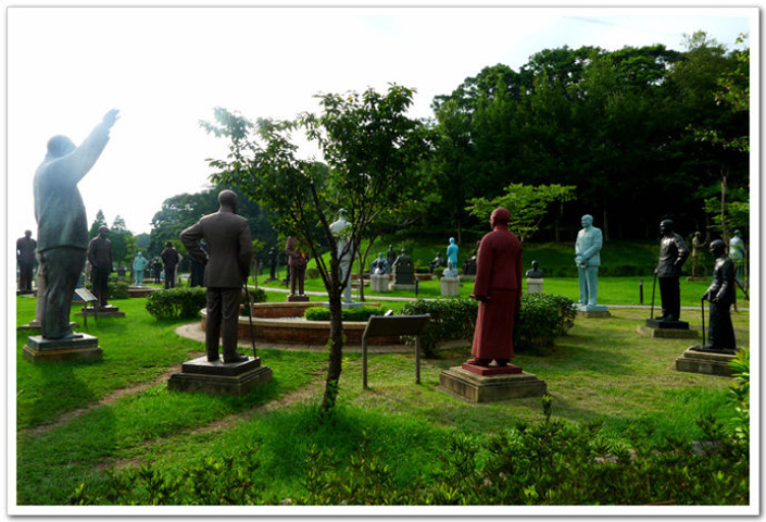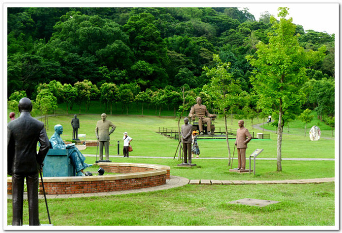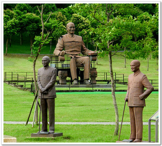 慈湖风景区一个绿色草坪上,摆放着许多从台湾各地汇集来的蒋公各式塑像。原本是因为政治原因要把这些金属塑像放到熔炉里化掉,慈湖的地方长官听说后觉得不妥,于是开辟这里作为蒋公收集塑像的地方,当这个消息稍晚些传达到熔炉处的时候,蒋公的一座雕像已经被砸的七零八落了。如今只能残缺的树立在这里了。