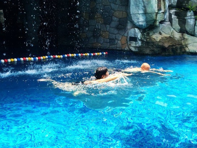 泳池不深不浅,还有人造假山和水帘洞,洞里就算是室内泳池。虽然不是正规比赛池,除了儿童区,其他地方成年人完全可以游起来——看,老爸老妈耍得可欢了!