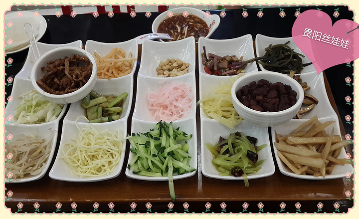 按面皮收费,一份面皮有十张,十五块钱,菜随便加,脆绍和酱肉丝分别8元一份,脆绍是这面的特色,很好吃。蘸水是酸汤,可以加糊辣椒等,酸酸辣辣的就是贵州的口味。