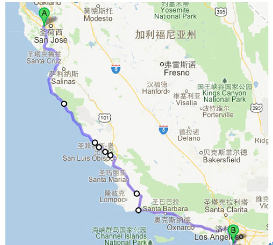 从旧金山到洛杉矶有三条并行的公路,1号、5号和101号。 1号公路的建筑年代最早,大约建于上世纪30年代,北起旧金山,南至洛杉矶, 沿美国西海岸蜿蜒前进,因此又被称为太平洋海岸公路,全长超过1000公里。 由于得天独厚的地理环境,它一边是海阔天空惊涛拍岸,风帆点点碧波万顷;一边是陡峭悬崖群峦迭翠,牧草如茵牛马成群,风景美不胜收,被称为是世界上最美最神奇的公路,美国家地理杂志称它为一生必去的50个地方之一。