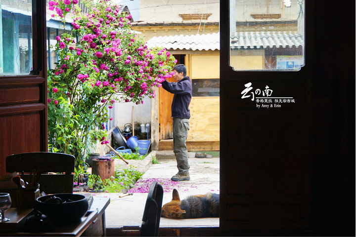 老板在修剪枝叶,小黄在一旁晒着日光浴…………