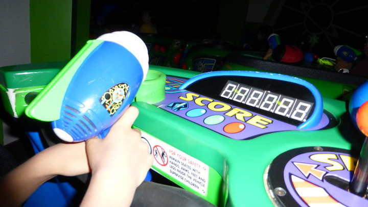 第五项巴斯光年排队排到一半,突然机器发生故障,要等一个小时再开放。于是兵分两路,爸爸带着大的去玩Star Tours, 我和小的去玩AstroOrbitor飞船。飞船盘旋上升,不能低头往下看,一看就头晕。还是小人厉害,还和下面的人挥手致意。飞船玩了两轮后,Star Tours散场,巴斯光年重新开放。巴斯光年是激光射击游戏,孩子们玩疯了!