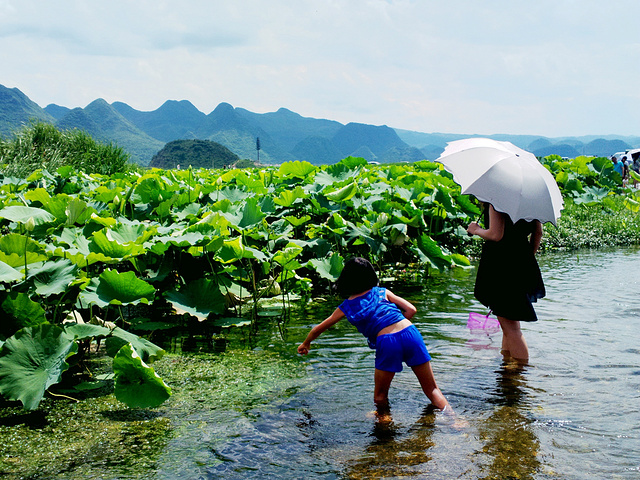 我们略早了十天来,大多的荷还只是少女般的骨朵,但已然让人心醉。普者黑四面皆水,如软绸般铺开去的水,清亮见底,舟驶过,鱼虾们先是受惊的窜开,旋即又好奇的聚拢,渐渐的就习惯了,船家的浆点一点,就躲一躲。