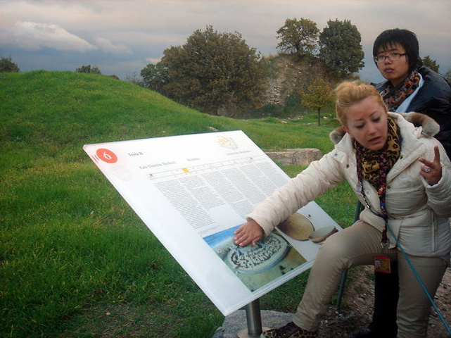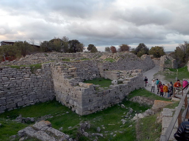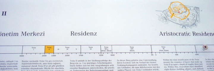 特洛伊城西邻爱琴海,北边就是达达尼尔海峡。是个美丽的地方。实际上特洛伊是公元前1600年前后古希腊人渡海所建,到了公元前1300年的时候,这里已经很繁荣了。特洛伊城是一座被烧毁的城市的遗址。特洛伊城遗址的发掘,始于19世纪中期,延续到本世纪30年代。考古学家在深达 30米的地层中发现了分属9个时期、从公元前3000年至公元400年的特洛伊城遗迹。走进这片巨大的遗址区,不同的地点都标上了号码,每一个号码对应着不同的时期的遗迹。特洛伊1是公元前3000年到2500年,特洛伊2是公元前2500年-2300年----特洛伊9就是公元前80年-公元500-1000年。总之,每个时期都出土了很多东西。