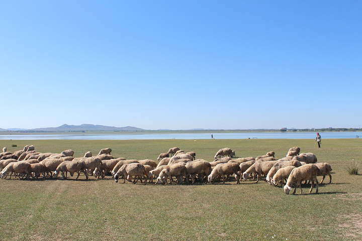 散养羊群在天鹅湖边草场进食