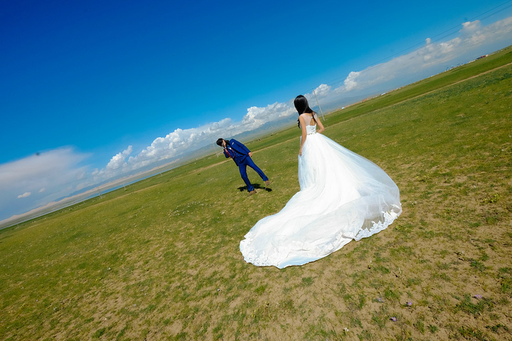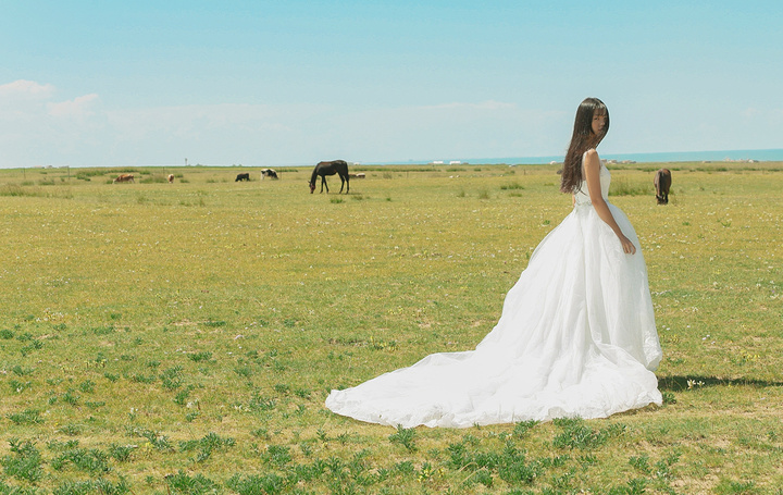 途中,我们看到一个没人的草地,就停车换婚纱了。但其实 太阳太猛了,根本就拍不到什么,而且发现一个很大的问题,没想到自拍婚纱真的真的很难,平时脚架拍日常就是很简单的啊,没想到,婚纱真的一点都不好拍。