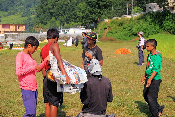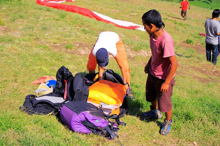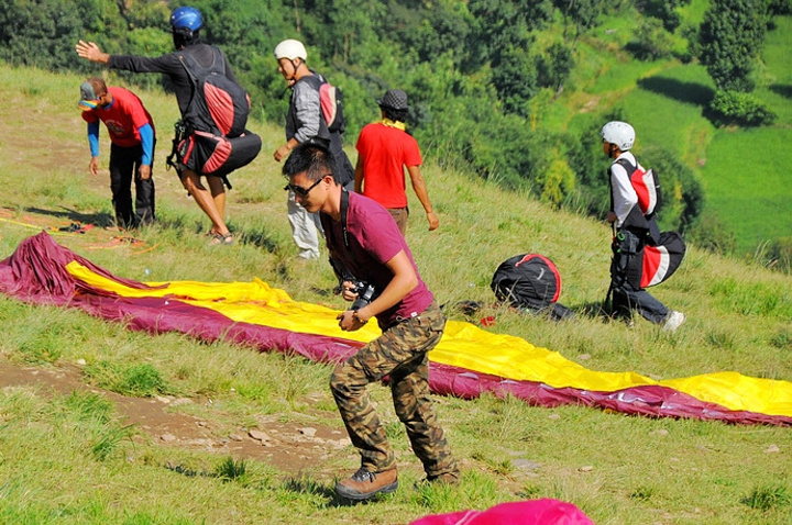 空地上聚集的很多当地小伙一窝蜂的冲上来争抢着收理滑翔伞。