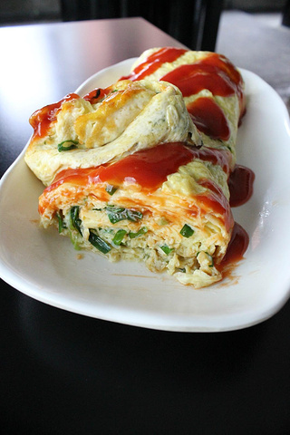 鸡蛋卷上涂上慢慢的番茄酱,真的是风味十足!