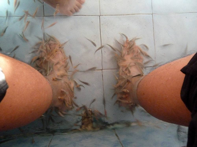 当天的最后一个旅游项目是小鱼SPA。在一个一米宽的水池里,有许多黑色的小鱼。洗完脚后,踏进水池,这些小鱼便都聚拢来,轻轻地咬着你的腿和脚。刚开始,感觉有些痒,后来,便是很舒服的感觉了。来自游记那一片蔚蓝——普吉岛