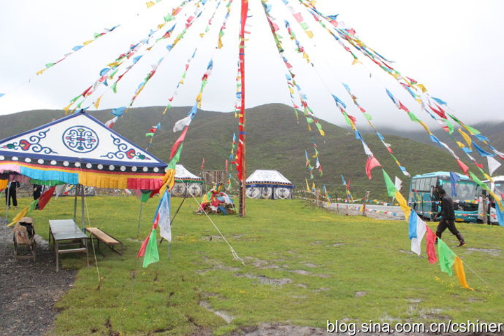 休息完毕,我们继续赶路,一路上我们看到很多牦牛在绿色的草地上,终于来到一个草甸,草甸上有一些蒙古包,我们可以走进任意一个蒙古包,吃一些特色的小吃,如:烤羊肉串、牦牛酸奶、奶茶等,儿子尝了羊肉串,10元一串,我尝了酸奶,15元一杯。如果是晴天,这里应该可以骑马,还有演出。但我们去的那会儿,雨下得很大,而且很冷,所以我们很快就离开了。