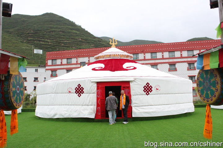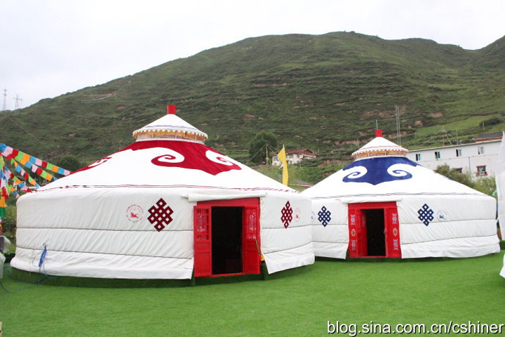 很豪华的蒙古包坐落上绿色的地毯上