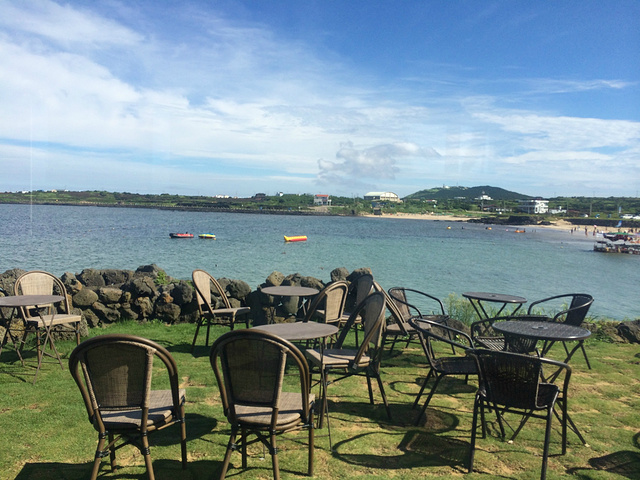 牛岛刚刚下完雨,路面有点湿,因为我们三个人都没有国际驾照所以只能租自行车,一辆车三小时1万韩币,三个人3万,需要留一本护照在那里。刚上岛有很多租车的地方,我们就在出了港口右手边第一家租的。租好后会给你一张地图,环岛骑下来大概要3个小时。我们从左边出发,本来是想骑全程的,结果一路走走停停吃吃喝喝,一个小时了才骑到第一个沙滩。