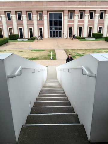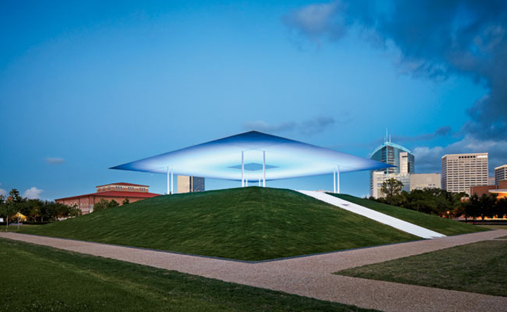 音乐艺术系的背后就是我这次特意来看的Twilight Epiphany暮光之城,也叫James Turrell Sky Space。坐落于一片草地之上,圣洁的不沾染一丝尘埃,神秘地好似来自外太空。远看像漂浮于空中。之所以叫它暮光之城,是因为这里适宜于傍晚或黎明时去观赏它在灯光照耀下产生简洁、美妙的造型效果。