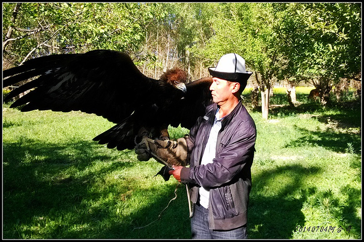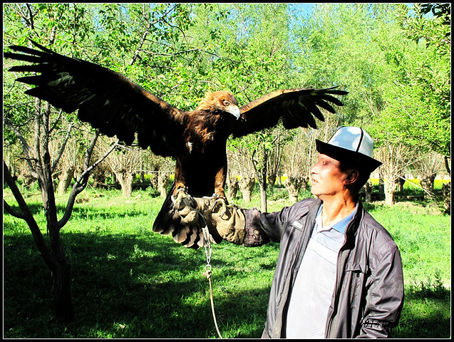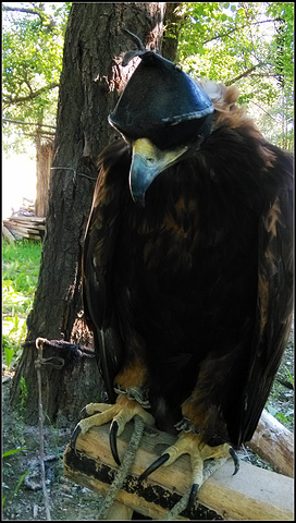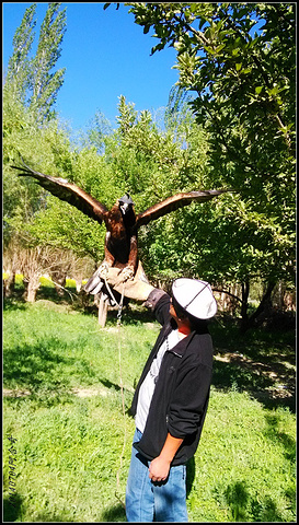 到达猎鹰之家,男主人向我们展示了引以为豪的猎鹰,小鹰是关在棚子里的,成年猎鹰在棚子外面,猎鹰的脑袋套着一个皮子的眼罩,陌生人不要随意靠近以免被攻击。猎鹰主人让我们带上皮手套子试着让猎鹰站在手臂上,晃动手臂猎鹰就会展翅现出雄姿。即使猎鹰主人在场,猎鹰的眼罩也是不能取下来的,因为猎鹰极有攻击性,取下眼罩恐怕会伤人,尤其会啄人眼珠。主人当然不担心这个,只有猎鹰主人敢让取下眼罩的猎鹰站在手臂上。取下眼罩的鹰隼眼神异常犀利,鹰爪也是尖利异常。主人介绍家里的鹰都是捕抓来的,抓到的小鹰最多只能养六年,超过六年必须放回野外保持其野性。