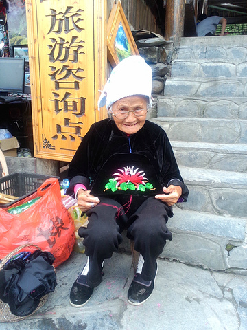 一进寨子,最先吸引到我的是苗族服饰,女同胞们把头发梳成髻子,高高的盘在脑顶上,髻子上插一朵红色的花,原生态纯天然的装饰品,真是美到不行。不论年纪,即使是老阿妈也头戴一朵花,少数民族的女人爱美爱到骨髓里。仔细一观察,只有年长的女人们的发髻是由自己的头发盘成的,而年轻姑娘们发根处还是染过的黄色,但发髻就是黑锭锭的,原来是毛线盘成的假发髻。现在少数民族的年轻人都很赶潮流,发色发式也是各种各样,可能只有节日才会打扮成最传统的样子。