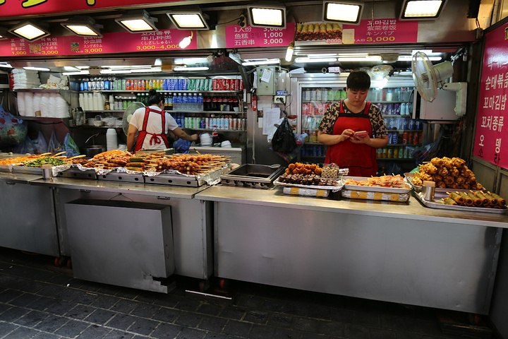 像这样的路边摊,真的是在各处都能看到哦!好多像这样的街头饮食,卖着不同样式的韩国食物,像小鱼糕,炒年糕,烤肉,果汁鲜榨什么的,真的是如果饿了渴了当下就能解决!超方便的!我和闺蜜也吃了一些~但是不能多吃啦,得留着肚子吃晚上的韩餐嘛~