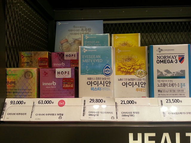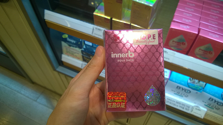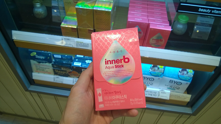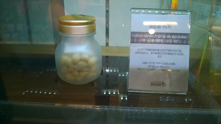 其实更让我感觉惊奇的是这个!我跟导购员姐姐说,韩国小姑娘们是怎么应对皮肤干燥的,她把我领到这个柜台!(不要问我怎么懂的韩文,导购员姐姐是中国留学生呢)Health&Food!我还以为错啦,结果她说韩国现在流行口服化妆品呢!就是这个叫因美(innerb)的品牌~~这是真的么?怎么可能!?我就好好听她讲啦!