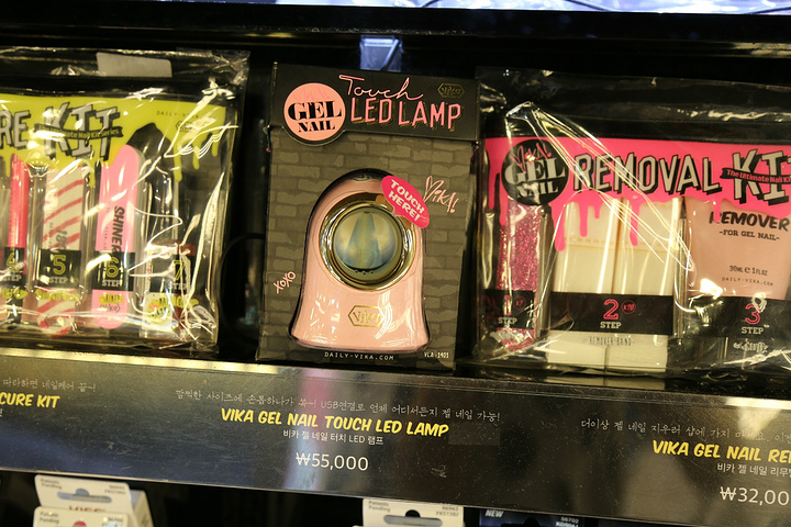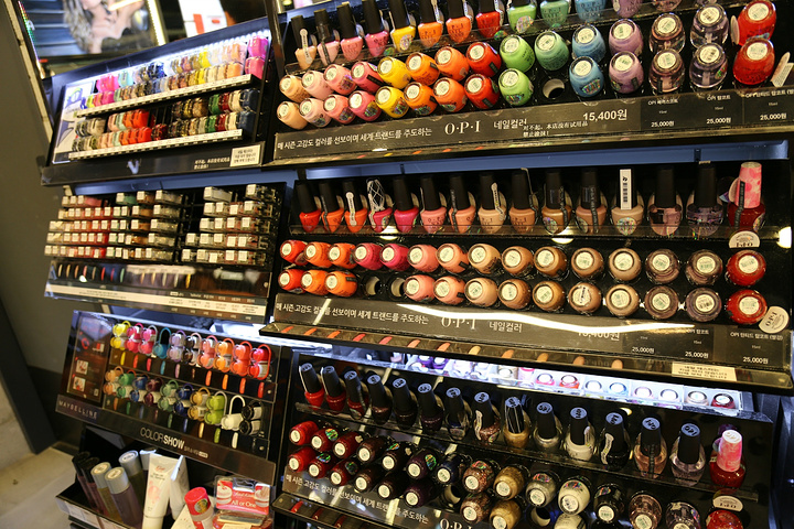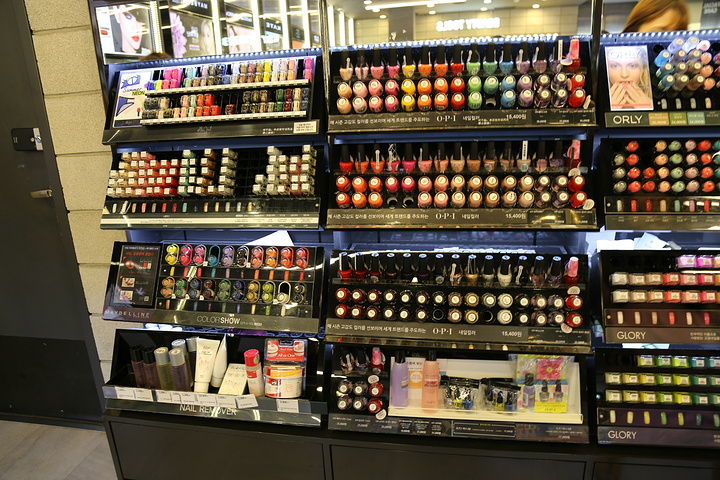 指甲油!我可是见到指甲油就走不动路啊……更何况这满满一货架!还提供试用!哈哈,为了看哪个更适合我嘛~自然要谨慎选择!结果发现啊,韩国的指甲油颜色更加正,范儿很足!即使从室内的暖光处出来,到门外的冷光环境,颜色差别也不会太大,真的满意满意!