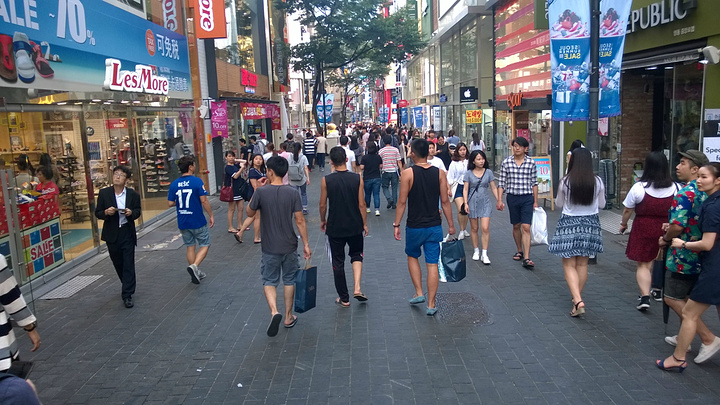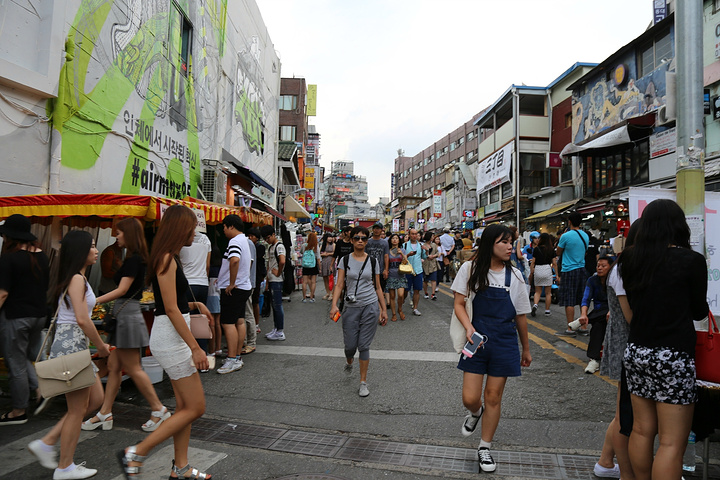 下了飞机,去旅馆放下行李,再到弘大已经是下午五点多啦!不顾旅途的劳顿,看到弘大游人如织,我俩也是莫名的兴奋!本来嘛,这两天是周末,所以到哪儿哪儿都会人挺多的吧!我俩已经做好准备,并且闺蜜是个人来疯,哪儿人多就好往哪儿钻!