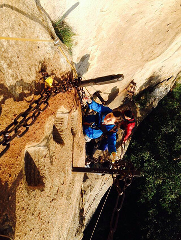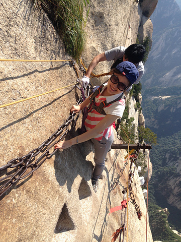 接着我们又前往南峰长空栈道,人好多(保险带30元每人)排了一个多小时才轮到我们,长空栈道是在一段20米长的台阶下面,下台阶也是垂直的,长空栈道大约30米,很好玩,脚下就是万丈深渊。贾平凹在《商州》里面曾写到,主人公在华山脚下捞尸体,摔下华山的人家属都会找人找到亲人尸体然后背上山,一次500元,好恐怖~