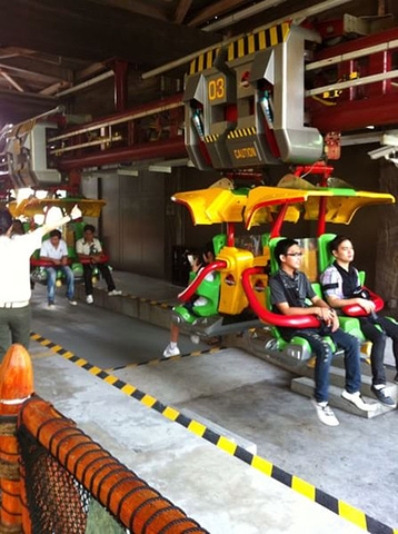 大家乘坐圆型船筏漂流,进入侏罗纪丛林世界,一船人会被在黑暗伸手不见五指的空间里坐电梯一样慢慢升高,没有心理准备的前提下真的想象不到,