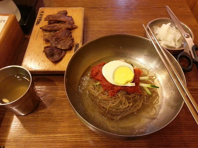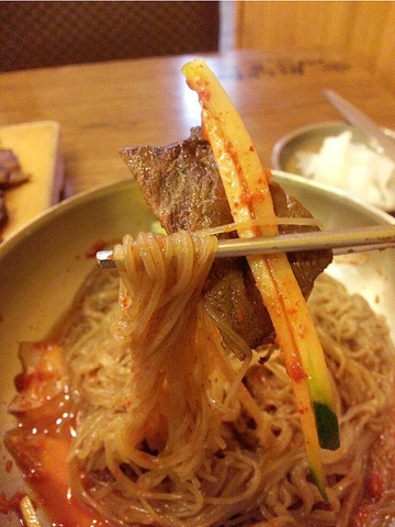中午和闺蜜吃了冷面~具体饭店的名字忘记啦!但是他家除了冷面,还给烤肉的!烤肉加冷面,真的是又管饱又解暑!中午吃了这个,真的是解饿又凉爽的感觉~