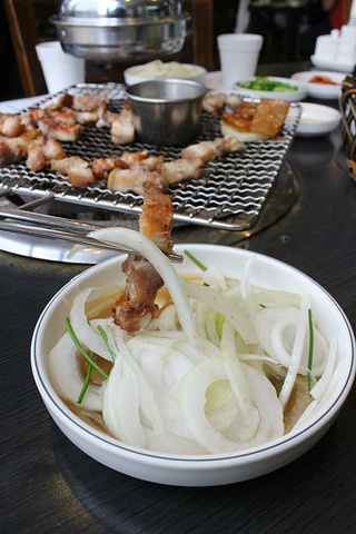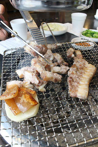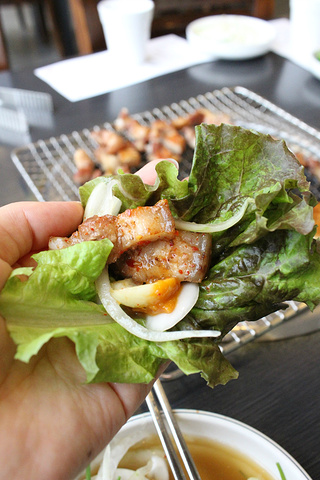 烤到滋滋作响的猪肉,再蘸上好吃的酱汁,最后放进菜叶里,一口下去,从嘴巴美到胃里!下午舟车劳顿,吃到美味的烤肉真的是热泪盈眶啊!肉段外酥里嫩,生菜清脆鲜香,强烈推荐!