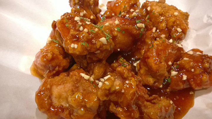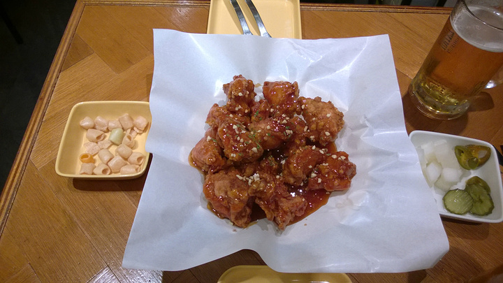 晚上我俩就在这家kkanbu chicken吃的“啤酒和炸鸡”啦!无骨的鸡肉块儿,裹上厚厚的甜辣酱汁,又酥又嫩,两个人加上啤酒一共花了两万四千元~