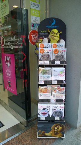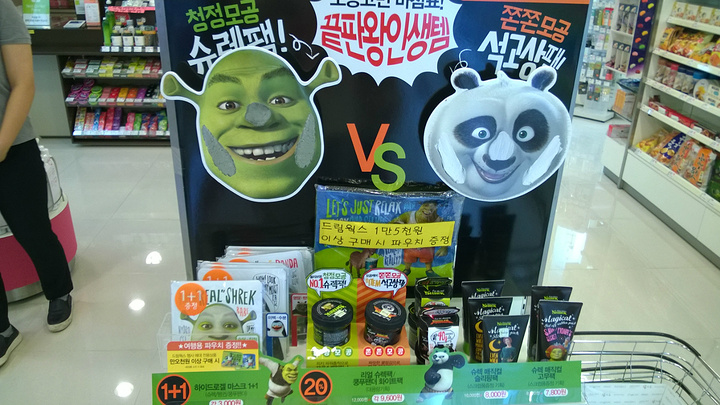 进门就看见史瑞克和功夫熊猫~哈哈,这两个电影角色在化妆界也较量上了!史瑞克主打毛孔清洁,功夫熊猫阿宝主打的是缩小毛孔,让皮肤更细腻~是不是超可爱!