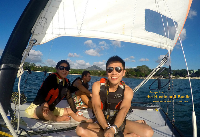 原本以为今天风平浪静的帆船会行驶得很慢,没想到速度非常快!在酒店前面的海域兜了一圈就回来了,大概就一刻钟的时间,时间虽短,但是感觉不错!