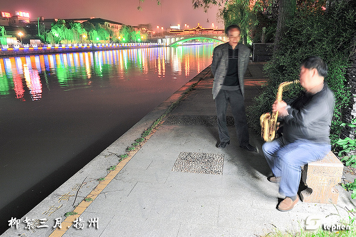 晚上的运河边大部分是扬州当地人来,有运动的,散步的,还有人吹萨克斯风,这位大叔吹奏的很好听,引来不少人停下脚步欣赏。