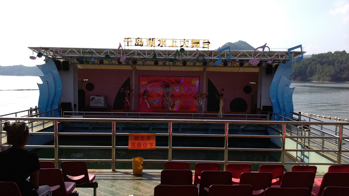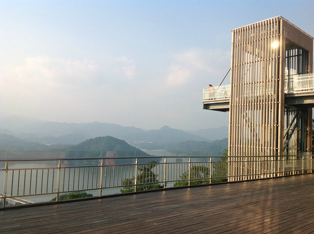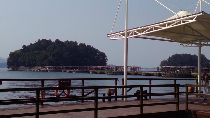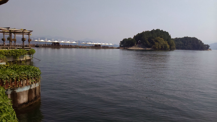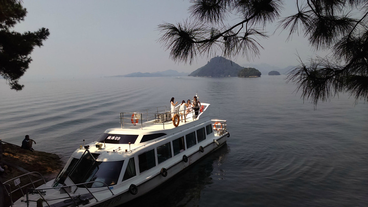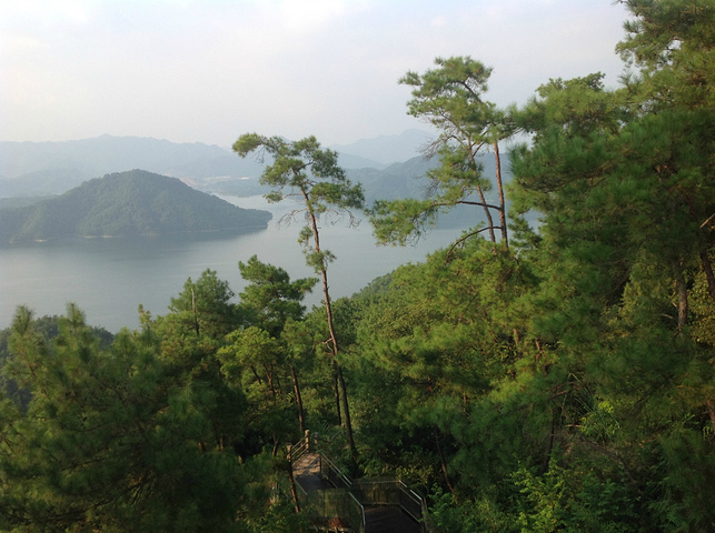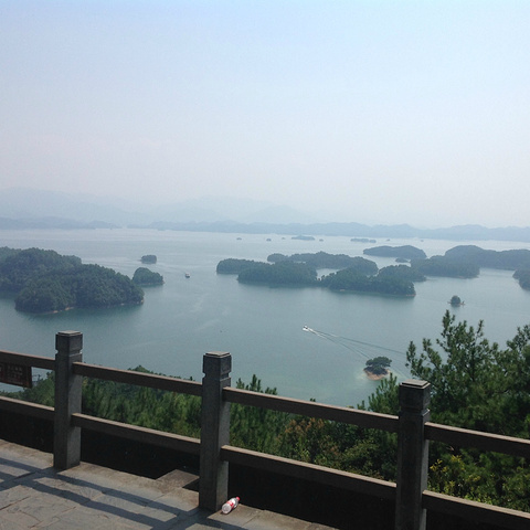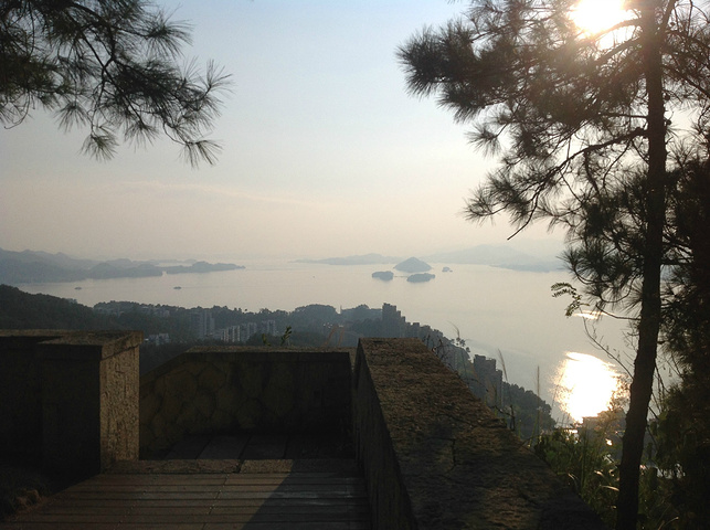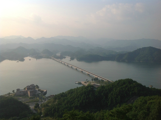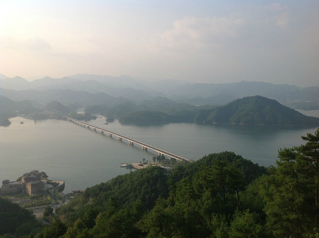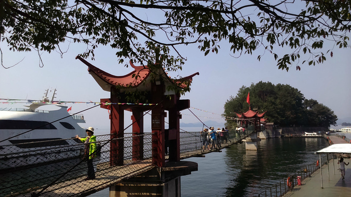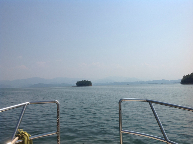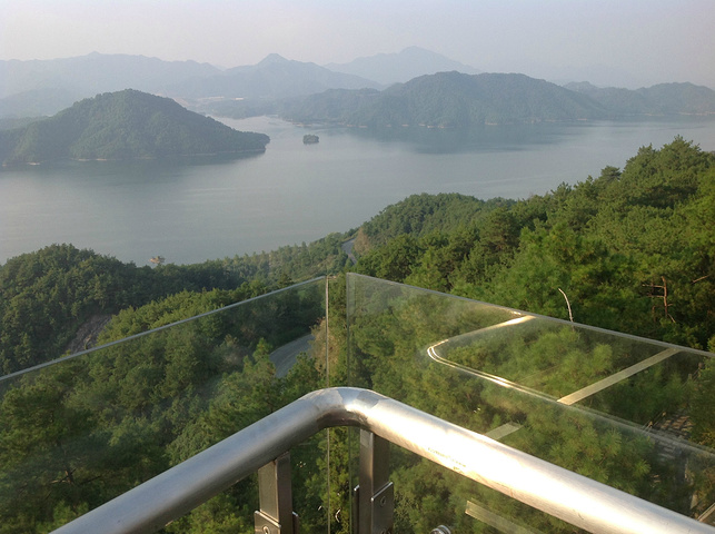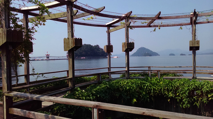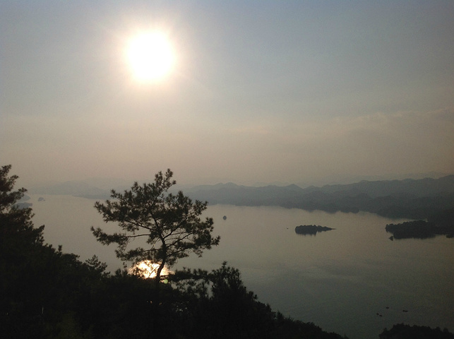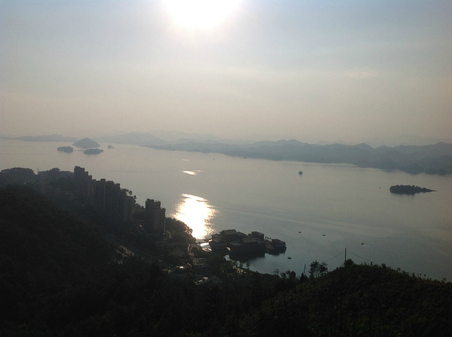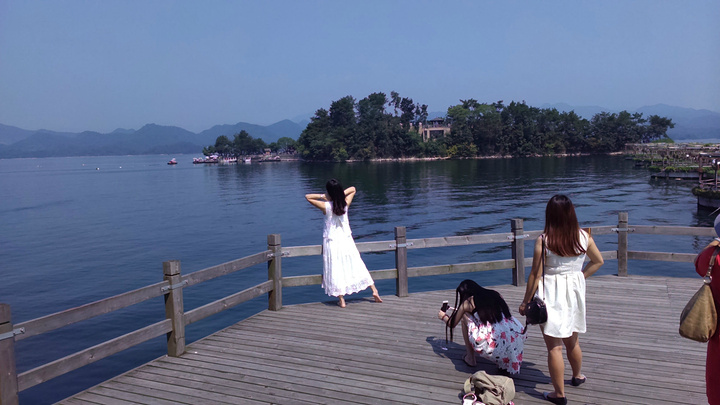 按顺序第一个到达的岛是月光岛,岛上到处是锁、还有月老;第二个渔乐岛;第三个龙山岛;最后是梅峰岛。龙山岛上面有个海瑞祠,渔乐岛上可以参加水上项目但是现在只有摩托艇和快艇,还有最最坑爹的人妖表演,30块钱可以优惠5元,不过岛上的自助餐55一位应该比龙山实惠吧,我和老公在龙山午餐一个银鱼鸡蛋,一个什么豆腐,一瓶啤酒,两碗米饭167,史上最最坑爹的了,所以建议亲们最好带上些裹腹硬货哈,别再挨宰了。梅峰岛上分东西两个观景台,海拔最高可以选择乘坐缆车往返每人60元,登峰一览众山小找到和票上一样的景观,呵呵。下午3:30左右游览结束。中心湖旅游区出口处有个微公交出租电车的地方,和老公租了一辆两人电动汽车(押金1000元,每小时20元)驱车沿新安大桥向北,直奔千岛湖大桥方那里有一座天屿山,山顶有新建的观景台在那里可以俯瞰整个千岛湖是千岛湖的制高点,在那里观看日落美了,这个没被大多旅友发现的小秘密,给我和老公带来了很大的惊喜,看过攻略的亲们你们一定要和爱人去山顶看看日落。但是租车就要有限制了,车行工作日6点下班,日落要持续到6点半7点左右,很遗憾呀。但是坐着迷你小电动穿梭在湖心小区的各条大大小小的大街小巷,和当地居民一起等红灯,看交警娴熟的指挥,闻着居民楼里飘来的饭菜香味又一次找到归属感呵呵,填补了我的小遗憾,电车隶属同一家公司,可以还到酒店附近的千岛湖广场,十分方便。一天愉快的旅程就此告一段落。旅途中结识了来自珠海的YY,童童三个美女把我们两个 “老家伙”也拍得美美哒。。。。。。回到酒店,享用酒店自助餐,88一位,千岛湖鱼有4-5种,还有海鲜,意面品种繁多,甜品里有一朵黄玫瑰棒棒哒,不是很甜,奶香味十足,冰激凌口感貌似美登高但是没有得到证实。嘿嘿!牛仔骨、皮皮虾、小龙虾吃到爆。对于鱼吗我本人不爱吃淡水鱼,老公对他家的千岛鱼头倒是情有独钟,其他几种鱼他也吃得不亦乐乎,但是鱼头做的的确很鲜,没有土腥味,喝汤的时候一定要点缀一点白胡椒,香葱和香菜 我觉得北方的小伙伴一定赞同我的建议。