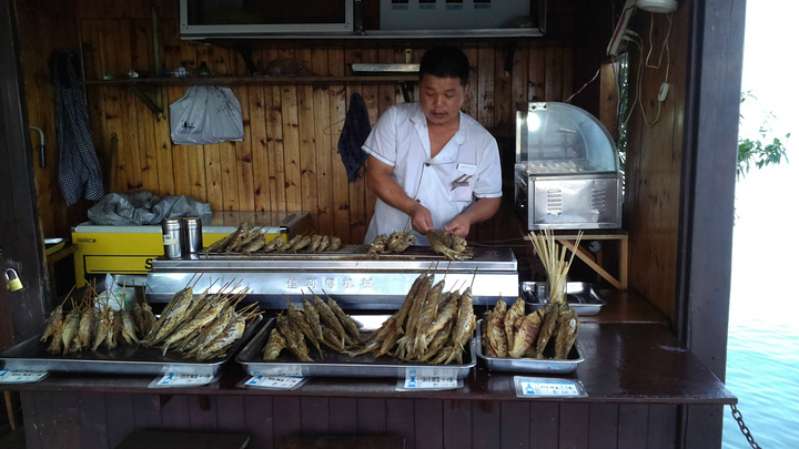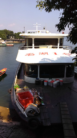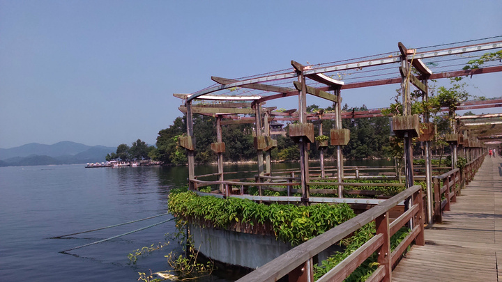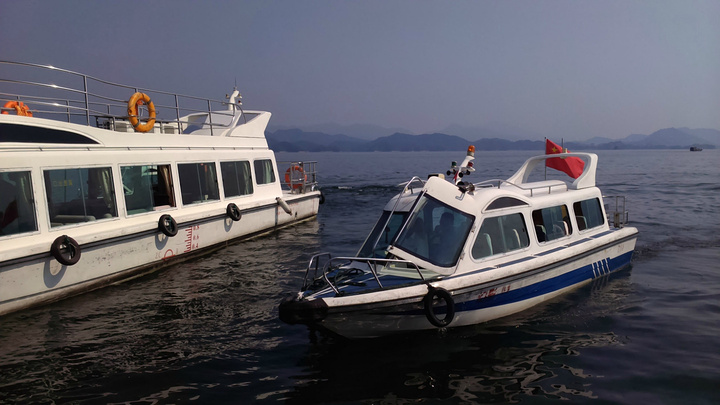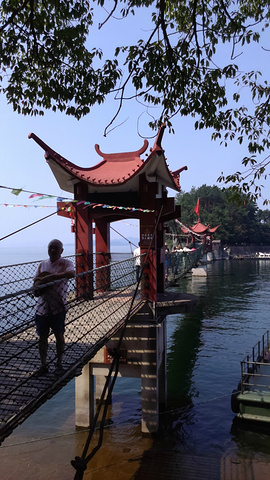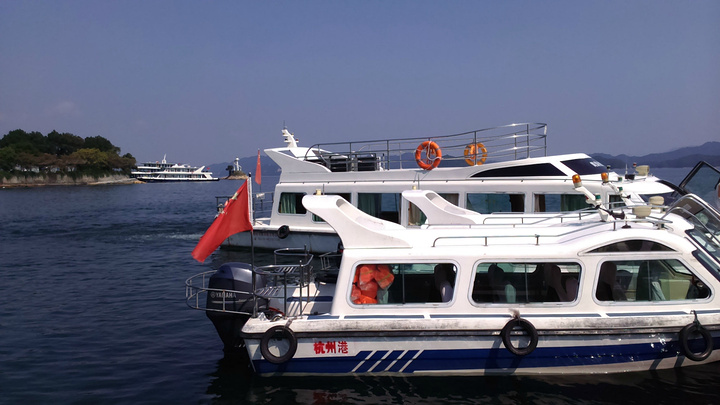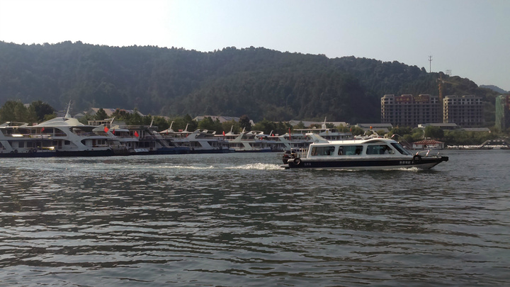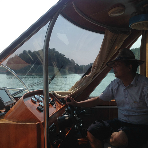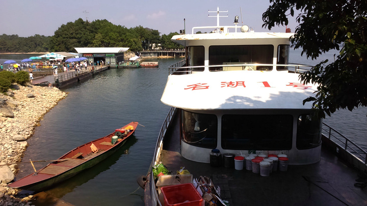 七点起床酒店6层用自助餐,超大的露台,湖光山色一览无余,牛奶浓浓的,麦片脆脆的,小馄饨香香的,总之早点杠杠滴。老公闻之这里实行滴滴打车,利用早餐时间就下载一个,叫了车出租司机和LG同姓,到中心湖景区11块。周师傅也很健谈,建议我们吃鱼头到清水鱼坊,老乡农庄,都是当地人吃的地方,我们决定借鉴。周师傅很有才的还特意为自己的两部手机做了个架子,亮点呦。由于船票已经在酒店预定,直接到2号售票窗口找到余大姐,拿了票,20人一艘“豪华”游艇,开启一段新鲜的旅程。由于现在不是旺季,岛上的ABC线现在都归为4条线(即梅峰岛、渔乐岛、龙山岛、月光岛)。