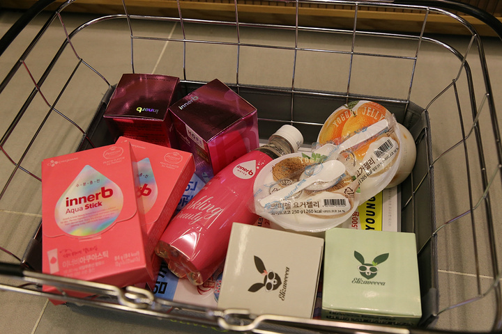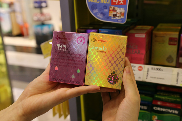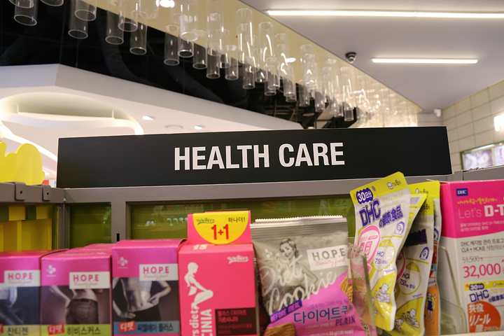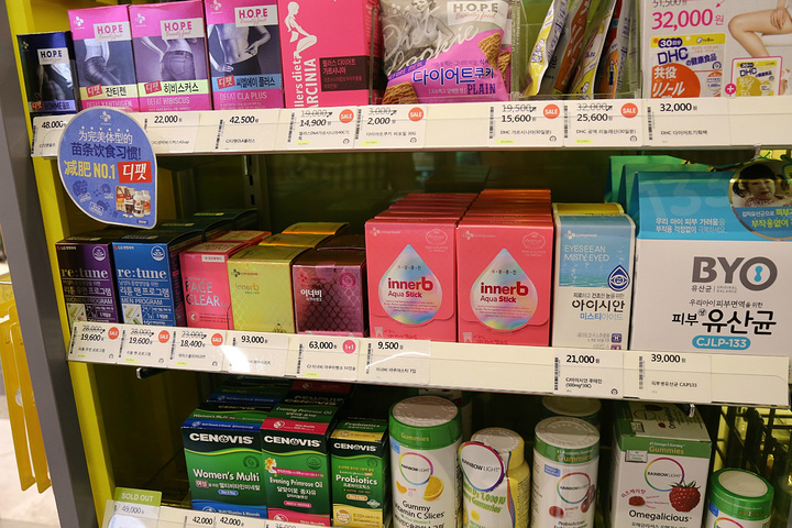 我正挑着,闺蜜好像发现了新大陆一般,说让我快过去,我过去一看,哇整整一个货架都是吃的呢~哦?仔细看还不是那种巧克力,糖果,零食那种吃的,有点不一样呢!上面写着Health Care,原来是健康保养品之类的。里面有维生素,还有减肥饼干等。我正随便看看,然后看到了这个在网上好几次看到的,其他旅客大力推荐的产品呢!我还想着来韩国一定要买呢,没想到在这儿遇上了!